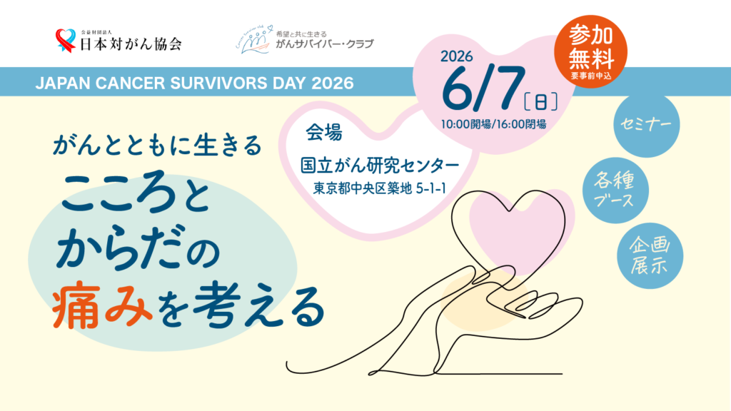 日本対がん協会は、がん治療や療養生活に関するさまざまな情報をお届けするイベント『JAPAN CANCER SURVIVORS DAY (ジャパンキャンサーサバイバーズデイ)2026 』を、6月7日に開催します。9回目の開催となる今回のテーマは『痛み』。